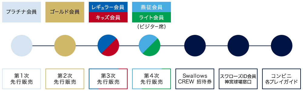 ※Swallows CREW先行販売期間中は1試合毎に購入枚数制限があります(プラチナ:6枚まで、ゴールド・レギュラー・キッズ・燕征・ライト:4枚まで)