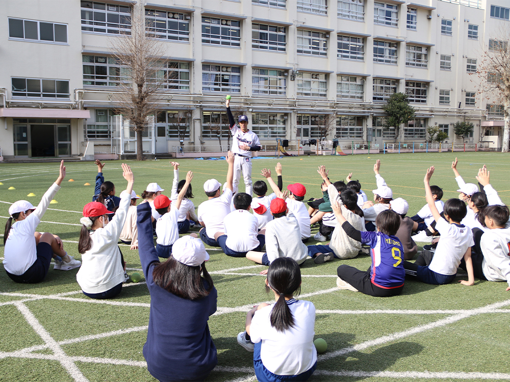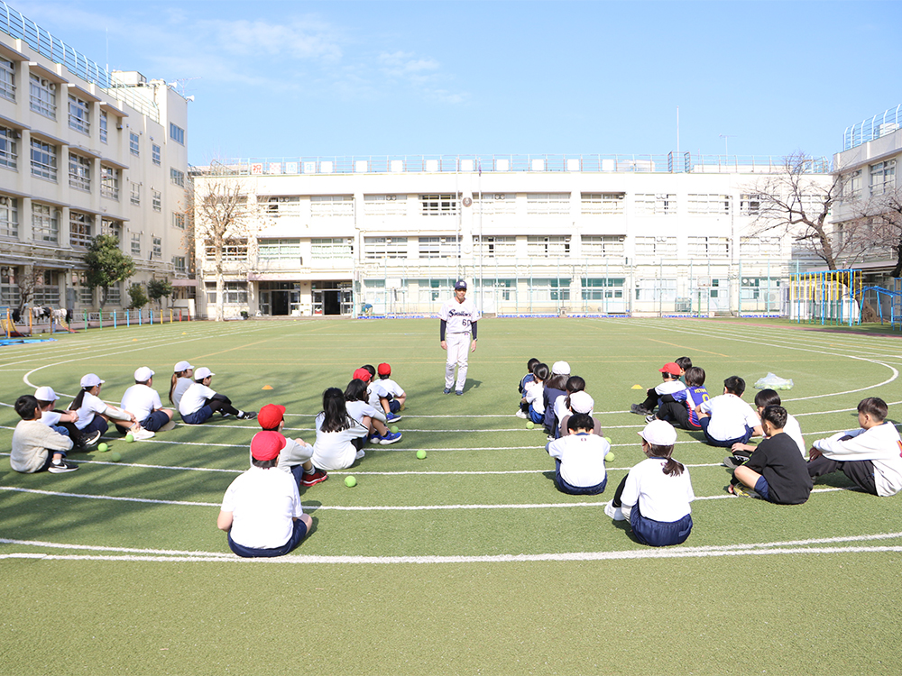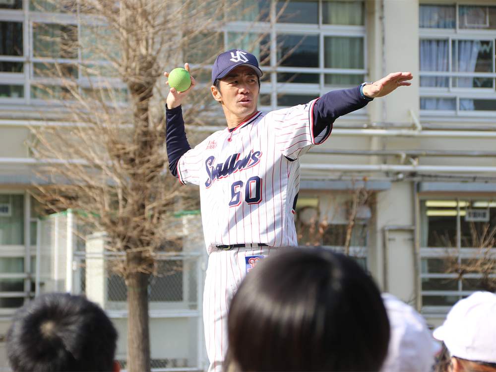 近年、小学生の投力低下が指摘されています。そこで、選手OBが東京都内の小学校で正しいボールの投げ方や遠投力を教えています。